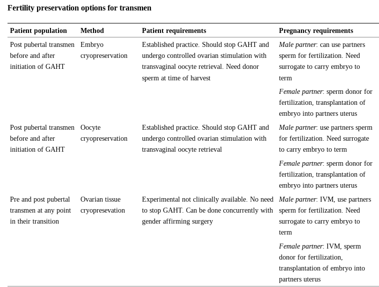 The following table is taken from a systemic review article conducted by Translational Andrology and Urology in 2020. It includes fertility preservation options for individuals with eggs, including experimental options that may or may not be available at this time. Similar information can be found in this Mayo Clinic article.