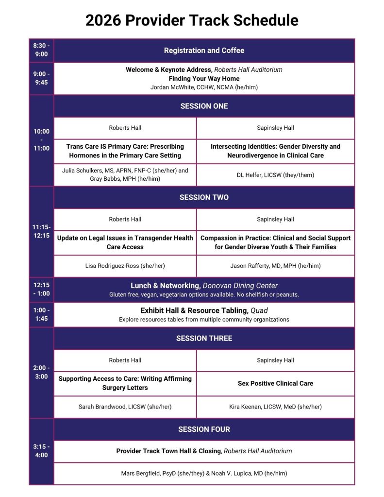 The Provider Track will provide interactive, evidence-based learning for interdisciplinary professionals across the care continuum to increase confidence in providing quality care for all TGD individuals. In addition to didactic presentations, attendees will have opportunities to learn from practitioners with lived experience and expertise in TGD health and wellness.